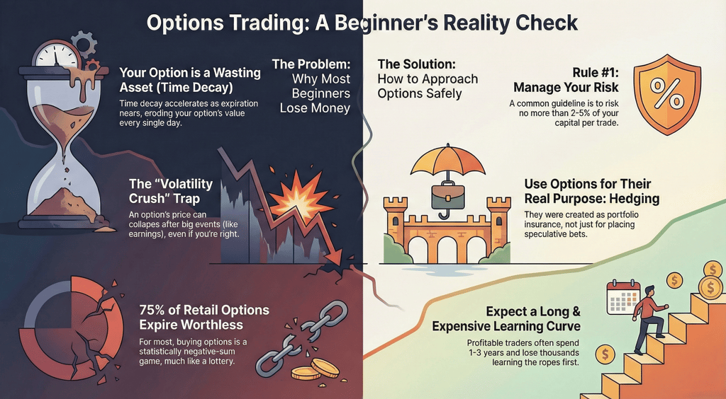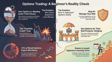 The overwhelming majority of retail traders who approach options as a way to make quick profits lose money. This isn't because options are a scam; it's because they're sophisticated instruments being used by unsophisticated participants who don't fully understand what they're buying.