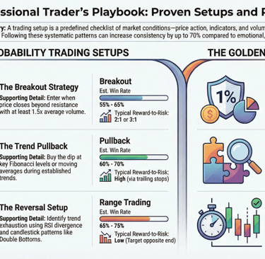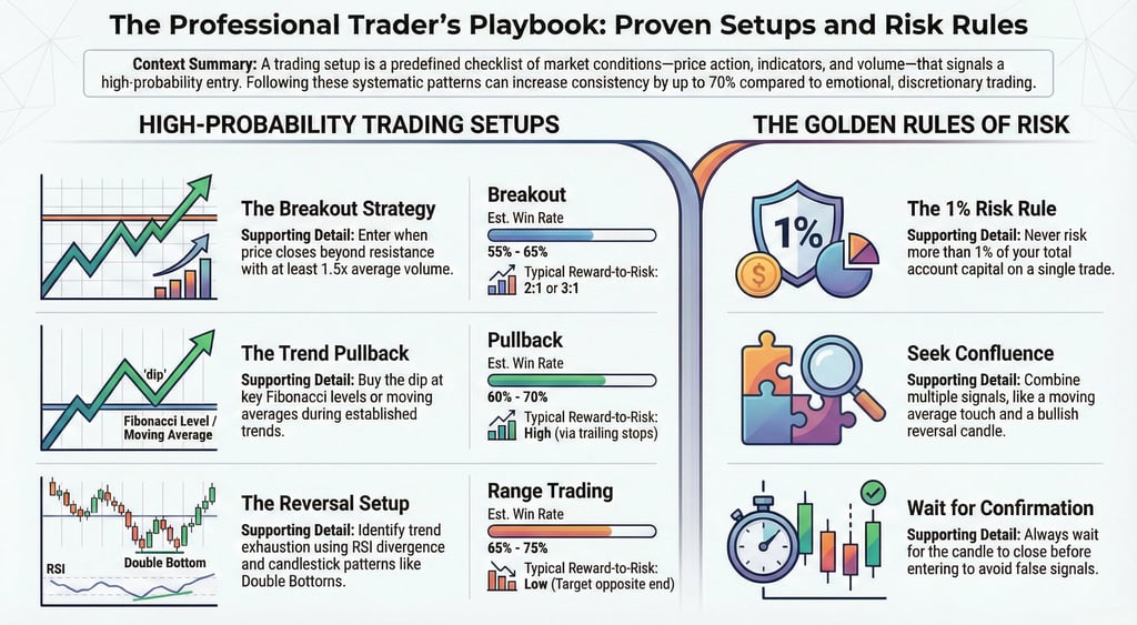 In this comprehensive guide, you'll learn the seven most reliable trading setups used by professional traders, complete with entry rules, exit strategies, and real-world examples. Whether you're a day trader, swing trader, or position trader, these setups will form the foundation of your trading strategy.